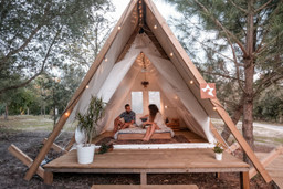 De Dreamsea Glamping in Moliets is de luxere variant van het Dreamsea Surf Camp, dat wij hierboven hebben beschreven. Het Dreamsea Surf Camp bestaat uit gedeelde tenten, en de Dreamsea Glamping bestaat uit privé tenten. De Dreamsea Glamping beschikt over een eigen restaurant-gedeelte, en een yoga-deck. Het leuke aan een verblijf in de glamping is dat je deel kunt nemen aan alle activiteiten van het surf camp gedeelte, terwijl je je wel terug kunt trekken in het glamping gedeelte. Je verblijft in stijlvolle privé glamping tenten, en maaltijden en gebruik van het surfmateriaal zijn inbegrepen. Ook hier kun je surfles en/of yoga optioneel toevoegen aan jouw boeking. De Dreamsea Glamping is populair onder gezinnen, koppels en andere mensen die op zoek zijn naar wat meer privacy. Lees meer.